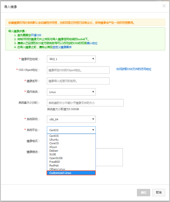 阿里云服务器 ECS支持您自行导入镜像使用。为了保证导入镜像的可用性,提高镜像导入效率,您需要在导入镜像时考虑限制条件。根据操作系统不同,如 Linux 系统 或者 Windows 系统,镜像文件的限制条件不同。本文凯铧互联讲述了阿里云服务器 ECS配置 Customized Linux 自定义镜像注意事项,当您的镜像操作系统不在阿里云所支持的已有平台类型中时,您可以在阿里云服务器 ECS 控制台导入镜像页面选择 Customized Linux(定制版镜像)的平台类型,如下图所示。