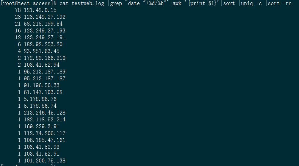 cat /alidata/log/nginx/access/testweb.log |grep `date "+%d/%b"`|awk '{print $1}'|sort |uniq -c |sort -rn